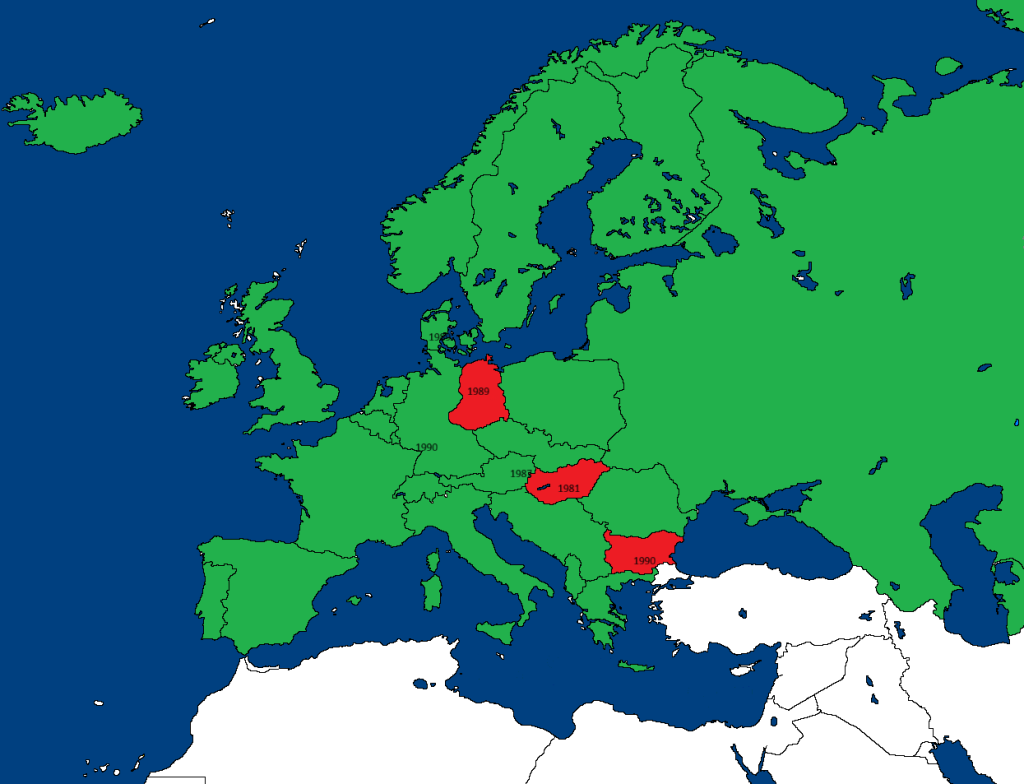 1970. Még mindig lendületesen növekszik Európa népessége. Többen születnek, mint ahányan meghalnak. Egyetlen kivétel van, az NDK, ahol 1969 óta többen halnak meg mint ahányan születnek.